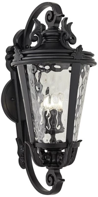 This large outdoor wall light design features lavish Mediterranean styling from John Timberland®, The design was inspired by the romance and magic of the port city of Marseille, and the large size makes it ideal for grand entryways, porch areas, or anywhere you need extra illumination and curb appeal. Details include clear hammered glass paired with rich detailing, and a textured black finish.