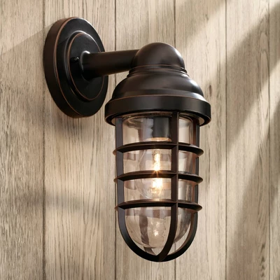 John Timberland Marlowe Industrial Outdoor Wall Light Fixtures Set Of 2 Bronze Metal Cage 13 1/4″ Clear Glass For Post Exterior Barn Deck House Porch